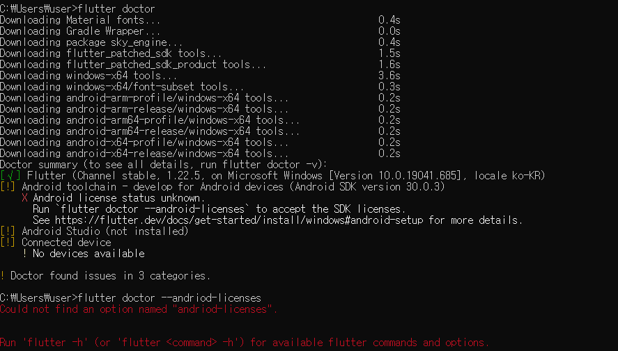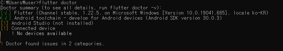 flutter 구축된 환경을 확인하기 위해서 flutter doctor를 입력 후 확인해보니