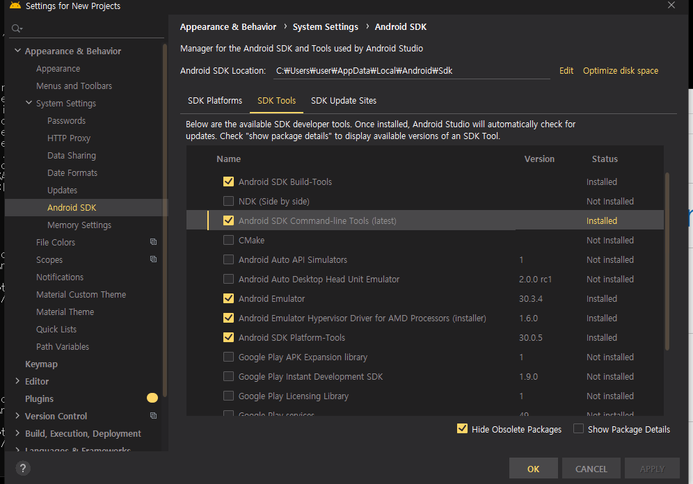 위 화면에서 Android SDK Command-line Tools가 설치가 안되어 에러가 난 듯하다. 위에 화면은 설치 후의 화면입니다.