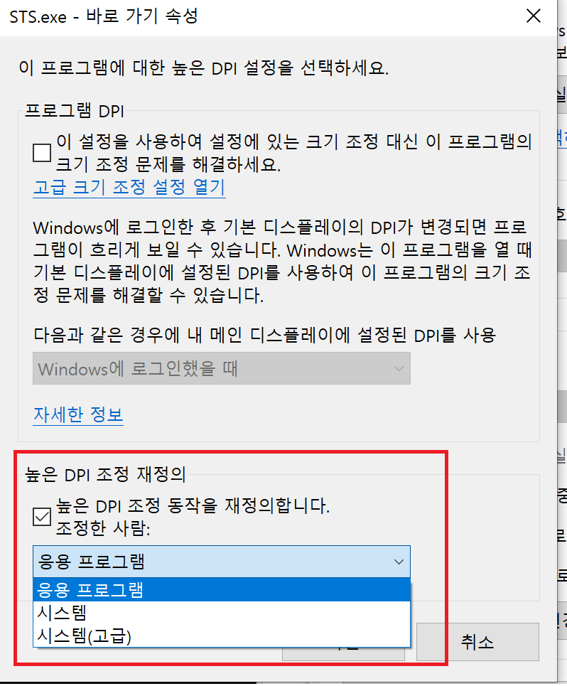 3. 높은 DPI조정 재정의 에서 체크 하고 시스템 고급으로 설정