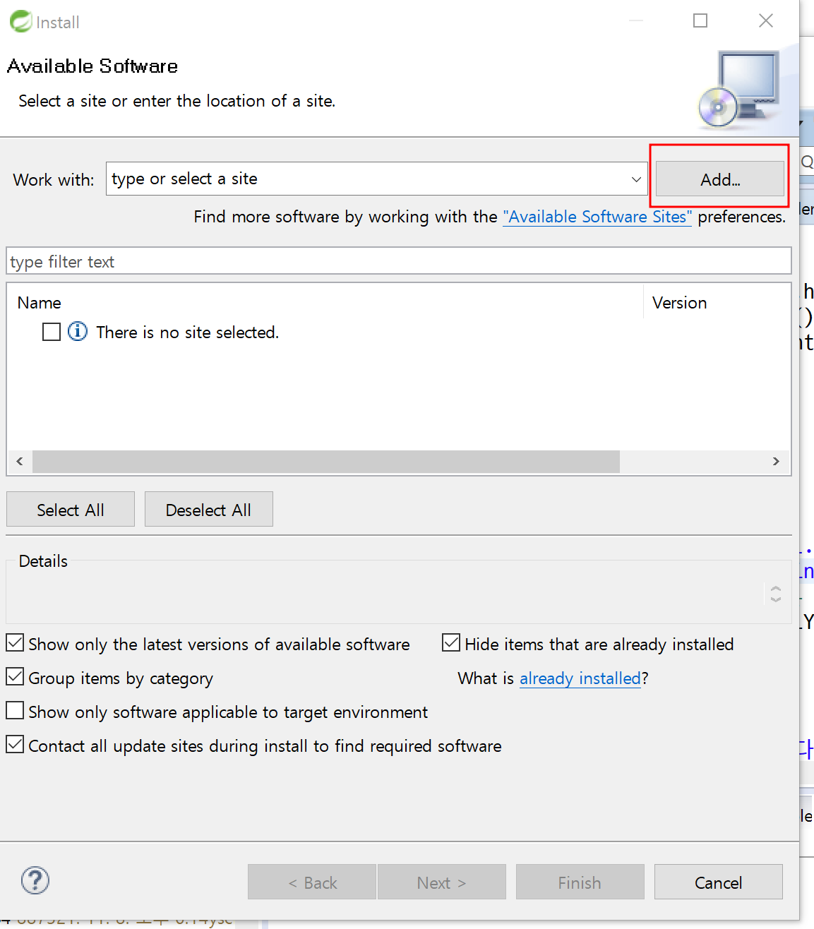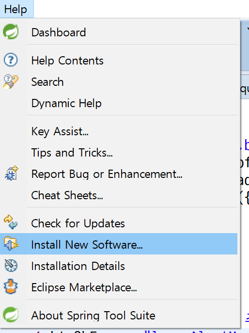 1. 상단 메뉴바에서 Help > Install New SoftWare... 클릭