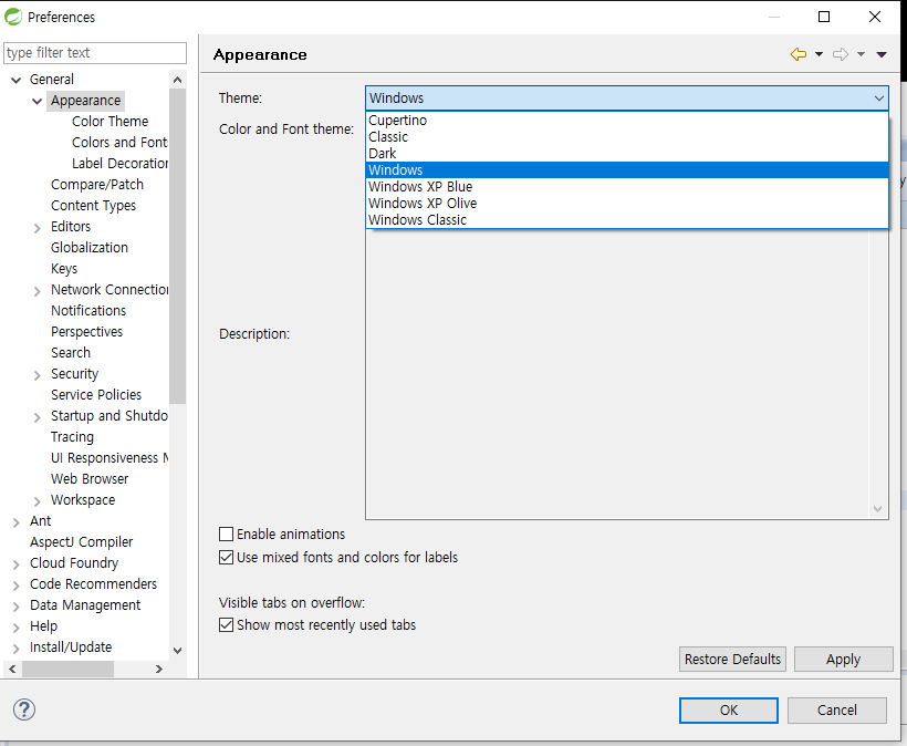 기본 설정은 메뉴에서 Window > Preferences > General > Appearance 에서 테마를 바꾸면 된다.
